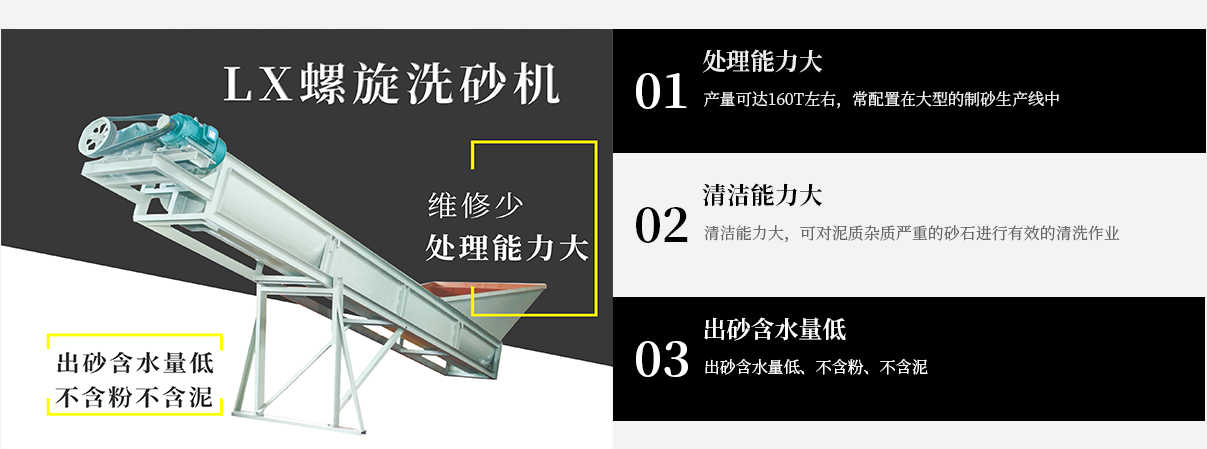 本系列螺旋洗砂機(jī)可清洗、分離砂石中的泥土,并在螺旋片的均勻攪動下,達(dá)到濾水去雜、提升輸送的目的。該洗砂機(jī)螺旋體長、螺旋片厚,密封系統(tǒng)嚴(yán)謹(jǐn);維修少、處理能力大;出砂含水量低、不含粉、不含泥等特點(diǎn)。